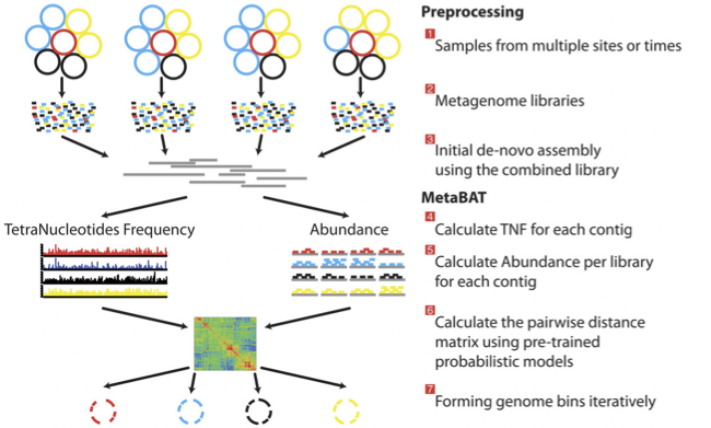 There is no clear winner between these tools, so it is best to experiment and compare a few different ones to determine which works best for your dataset. For this exercise, we will be using MetaBAT (specifically, MetaBAT2). The way in which MetaBAT bins contigs together is summarized in Figure 1.