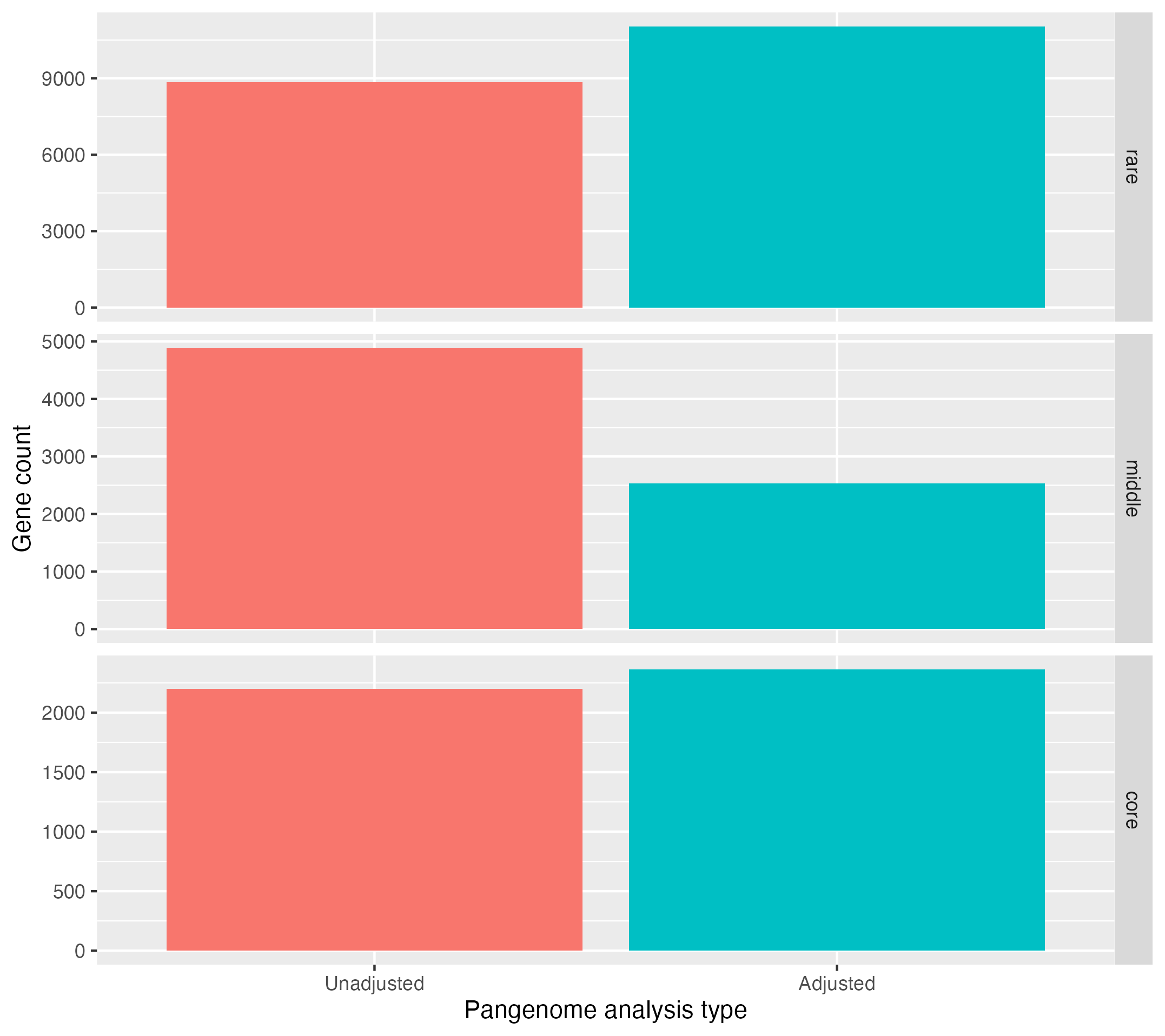 Observe that the core genome and rare genome sizes increase after adjustment, whilst the middle or intermediate decreases.